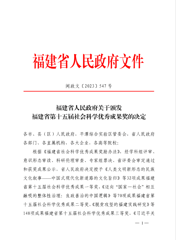 福建省社会科学优秀成果奖每两年评选一次,是全省社会科学研究成果的最高奖项,学术权威性强,获奖难度大且比例低,是衡量高校科研实力的重要指标,历来备受重视。