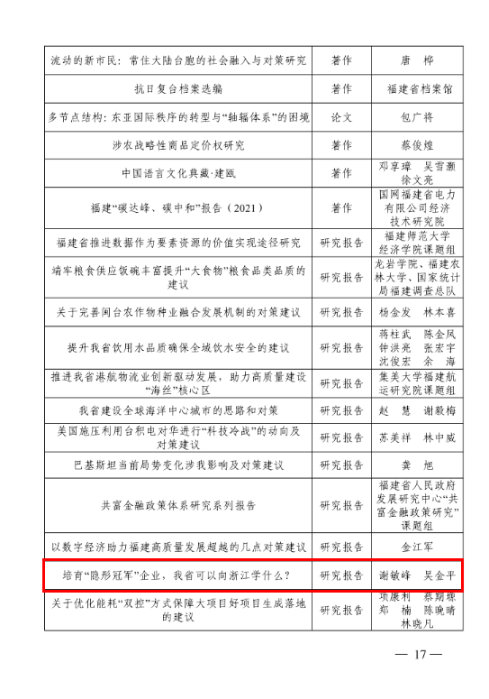 近日,福建省人民政府发布了《关于颁发福建省第十五届社会科学优秀成果奖的决定》(闽政文〔2023〕547号),大赢家体育app下载谢敏峰副校长等撰写的研究报告《培育“隐形冠军”企业,我省可以向浙江学什么?》喜获三等奖,实现了大赢家体育app下载省社科优秀成果奖零的突破。