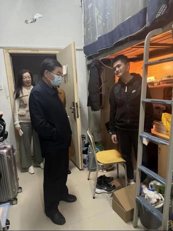 林子波书记走进学生宿舍,向同学们表达了学校的关心与问候,与同学们一起“拉家常”,“家里是哪里的?”在寝室住的还习惯吧?”“回家注意安全!”……一声声的亲切的话语,细心的询问,迅速拉近了师生之间的距离。林子波书记每到一处,实地查看学生公寓门管理员的到岗情况及门禁系统、宿舍饮水机、插座等设施使用情况,他叮嘱学生要注意用电防火安全,增强安全防范意识。他鼓励学生学好专业知识,锤炼过硬本领,保持积极向上的乐观状态,养成良好的学习和生活习惯,营造干净、整洁、温馨的宿舍氛围,要以寝为家,以校为园,共筑韶华梦想,共创美好未来。