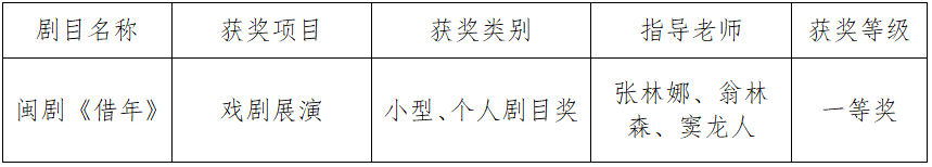 近日,由福建省文学艺术界联合会、福建省教育厅联合主办,福建省戏剧家协会承办的第五届福建省大学生戏剧节暨第七届福建省大学生艺术节戏剧展演圆满落下帷幕。由张林娜、翁林森、窦龙人老师指导的闽剧《借年》荣获全省大学生戏剧展演项目“小型、个人剧目奖”专业组一等奖,并入选全国第七届大学生艺术展演。学校荣获优秀组织奖。
