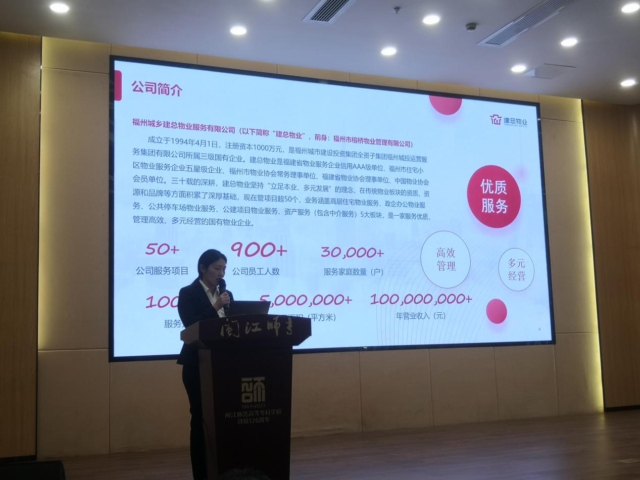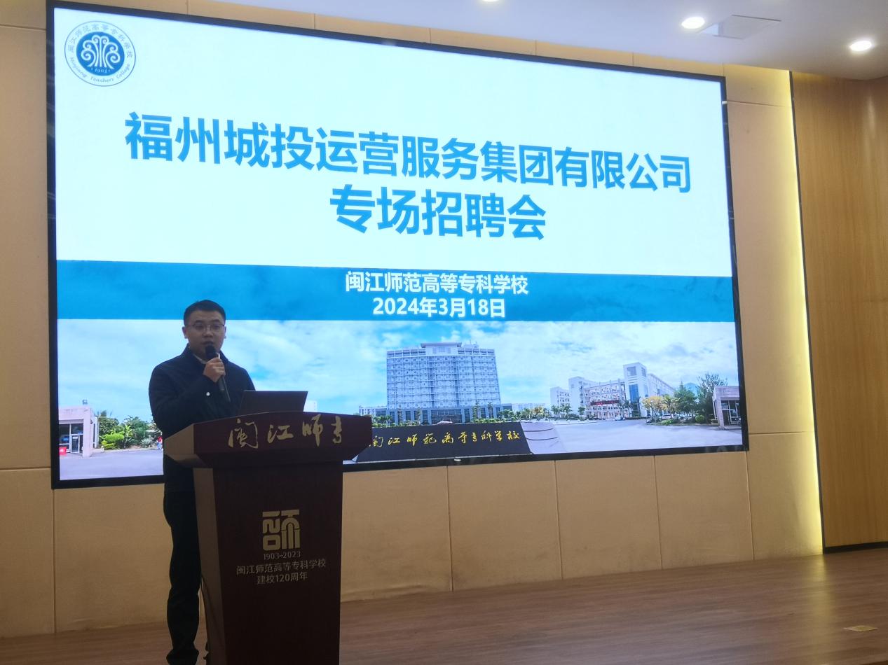 招聘会上,林为民向参加此次招聘宣讲会的学院表示热烈的欢迎和衷心的感谢,并介绍了福州城投运营服务集团有限公司的主要业务。福州城乡建总物业服务有限公司、福州城投光大百龄帮颐养中心、福州闽江之心有限责任公司分别宣讲了企业情况和招聘岗位需求。本次专场招聘会,三家企业为大赢家体育app下载毕业生提供了14个岗位,需求人数共41人。