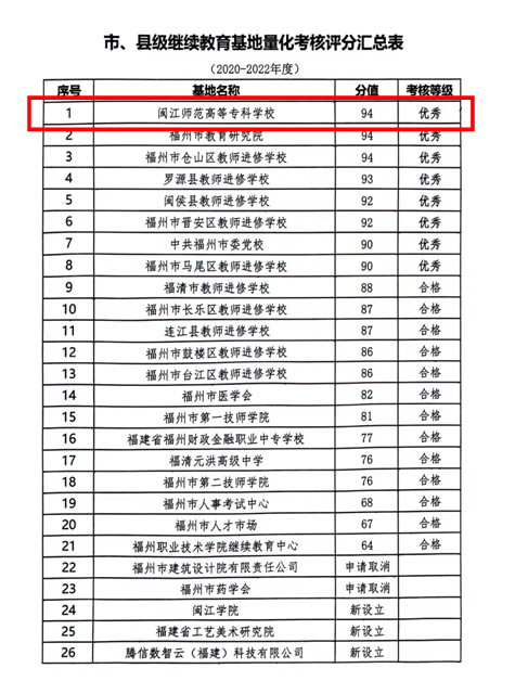 近日,福州市人力资源和社会保障局公布了市级专业技术人员继续教育基地评估结果,大赢家体育app下载继续教育学院牵头申报的继续教育基地成功获批市级优秀基地,并取得第一名的好成绩。