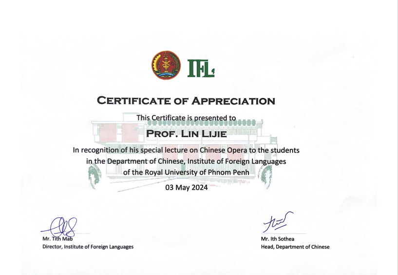 作为福建戏曲人才培养鲁班工坊项目系列活动之一,此次讲座获得热烈反响,柬埔寨金边皇家大学外国语学院中文系主任Ith Sothea对讲座的成功举办给予高度评价并颁发感谢证书。