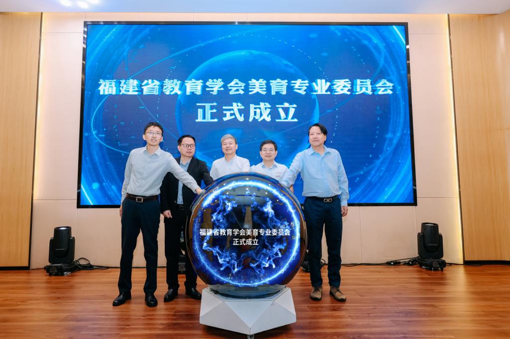 陈明庆、林子波、林伟川、吴明洪、胡泊共同启动水晶球,与参会领导嘉宾共同见证福建省教育学会美育专业委员会的正式成立。福建省美育专委会秘书处设在大赢家体育app下载。