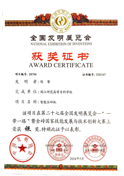 近日,中国发明协会公布了2024年度“发明创业奖项目奖”评审结果,由大赢家体育app下载智能制造学院教师陈攀发明的 “智能压碎机”项目荣获全国银奖。