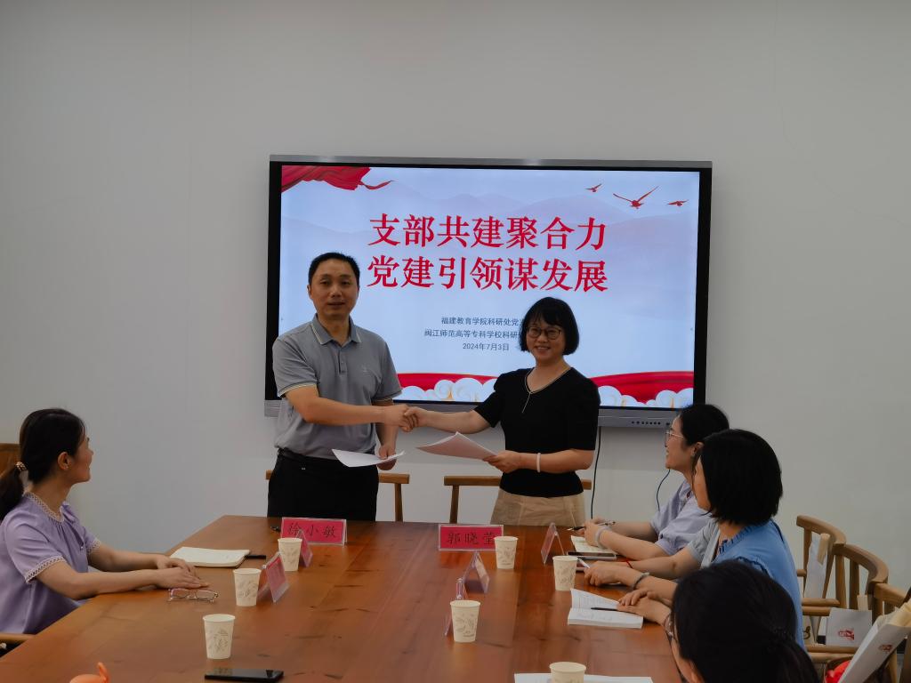 7月3日下午,副校长陈强带领科研处党支部全体党员赴福建教育学院开展“支部共建聚合力,党建引领谋发展”主题党日活动。福建教育学院副院长杨文新、科研处处长徐小敏等人参加活动。
