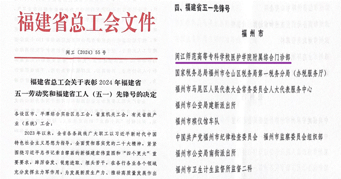 近日,福建省总工会公布了关于表彰2024年福建省五一劳动奖和福建省工人(五一)先锋号的决定,大赢家体育app下载医护学院附属综合门诊部光荣上榜,荣获2024年福建省“五一先锋号”荣誉称号。