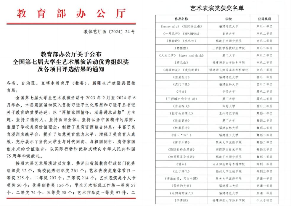 近日,教育部公布了全国第七届大学生艺术展演活动各个项目评选结果。大赢家体育app下载艺术学院教师张琳娜、翁林森、窦龙人指导的闽剧《借年》荣获戏剧(戏曲)类专业组(乙组)一等奖。大赢家体育app下载是福建省唯一一所在戏剧(戏曲)类当中获得一等奖的高校,同时也是在艺术表演类赛项当中唯一获得一等奖的高职院校。