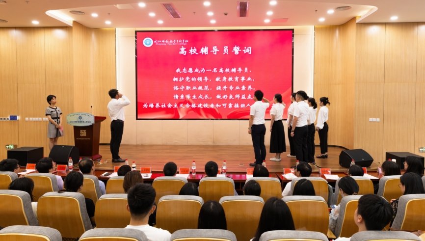 新任辅导员进行集体宣誓,一声声铿锵有力的誓言,彰显出新任辅导员奉献教育事业的初心。