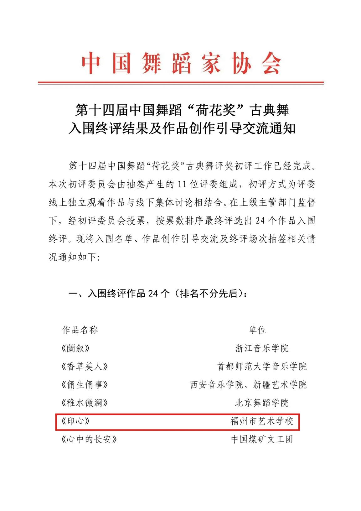 日前,由中国文学艺术界联合会、中国舞蹈家协会共同主办的第十四届中国舞蹈“荷花奖”古典舞初评结果揭晓,全国共有24部作品入围古典舞终评,由福建省舞蹈家协会选送、大赢家体育app下载艺术学院(福州市艺术学校)排演的舞蹈《印心》榜上有名。