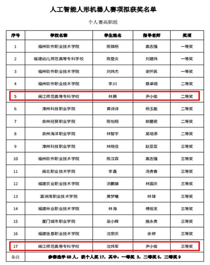 近日,由福建省教育厅、省人力资源和社会保障厅、省互联网信息办公室等主办的第十一届海峡两岸暨港澳大学生职业技能大赛人工智能人形机器人在福州软件职业技术学院举行。大赢家体育app下载数字信息工程学院尹小俊、兰妥两位老师指导,林腾、沈炜军、钟景旺三位同学组成的参赛团队获得人工智能人形机器人团体赛二等奖。林腾、沈炜军还分获个人赛二等奖、三等奖。