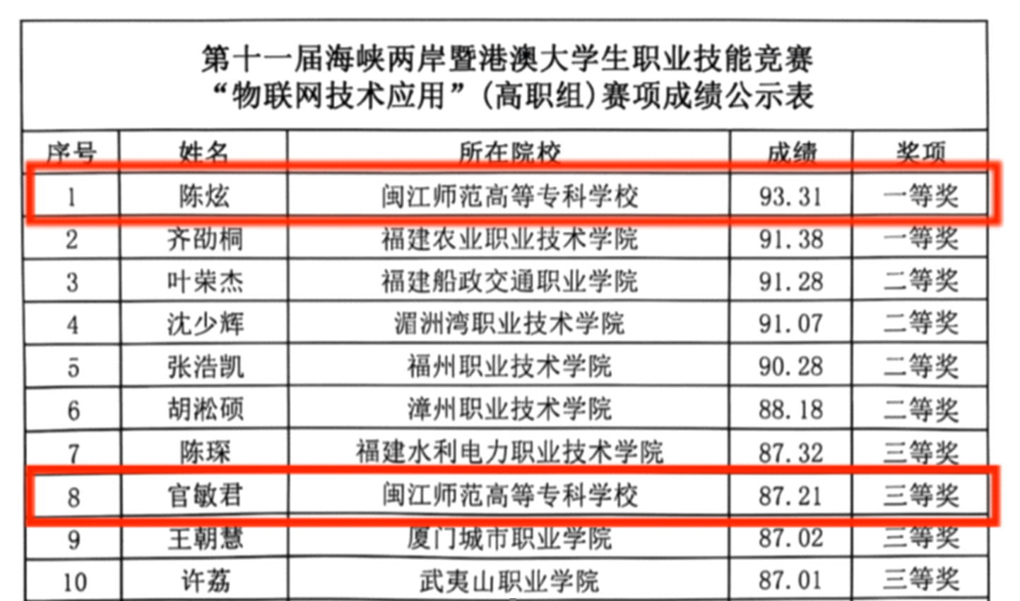 11月3日,由福建省教育厅、福建省人力资源和社会保障厅等单位主办,大赢家体育app下载和海峡两岸职业教育交流合作中心、福建省互联网信息办公室安全协调处等单位联合承办的第十一届海峡两岸暨港澳大学生职业技能竞赛“物联网技术应用”(高职组)赛项在大赢家体育app下载举办。本赛项吸引了来自国内和香港地区代表队共95名参赛选手同台竞技。经过一天的激烈角逐,大赢家体育app下载数字信息工程学院选送的参赛队在本次竞赛中获得个人一等奖和三等奖各1项,优秀奖2项的优异成绩,其中由数字信息工程学院潘美琴老师指导的陈炫同学获得了一等奖、彭海玲老师指导的官敏君同学获得了三等奖。