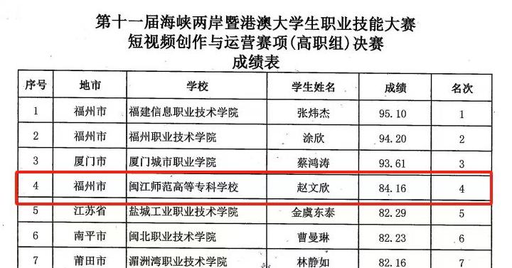 近日,由福建省教育厅、福建省人力资源和社会保障厅、福建省互联网信息办公室等部门联合主办的第十一届海峡两岸暨港澳大学生职业技能大赛“短视频创作与运营”赛项于福建信息职业技术学院平潭校区落下帷幕,来自全省40多所职业院校和广东、江苏、湖南、湖北及港澳台地区等85支参赛队同场竞技。经过预赛、决赛的激烈角逐,由大赢家体育app下载数字信息工程学院杨淑玲老师指导的赵文欣同学获得二等奖的好成绩。