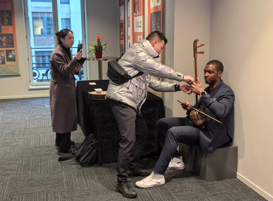 值得一提的是,期间学校还在巴黎欧视巴黎人文交流中心设置了一个特别的展览区,展示椰胡、逗管及双清等闽剧特色乐器,深受法国观众的欢迎。他们对这些传统乐器表现出浓厚的兴趣,不时上前细看乐器的构造,并在学校器乐教师的专业指导下亲自试弹这些乐器,感受中国传统音乐的韵味。这不仅为法国观众提供了一个近距离接触和了解中国传统乐器的机会,还通过沉浸式的参观体验,进一步加深了他们对中国传统音乐文化的认识和喜爱。