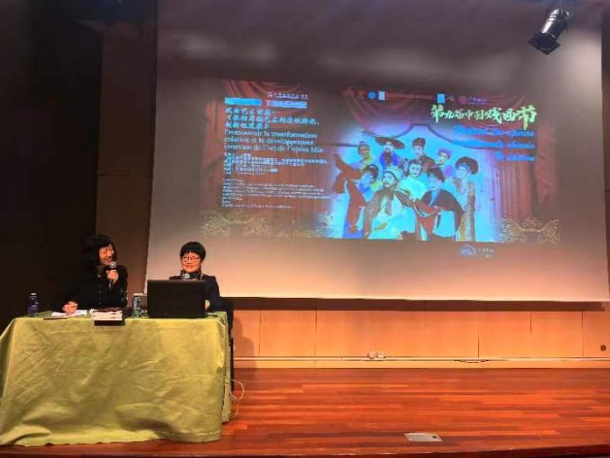 11月7日上午,江柳青副校长在巴黎中国文化中心主讲了一场戏曲艺术学术讲座,以《推动闽剧艺术创造性转化创新性发展》为题,深入浅出地介绍了闽剧的发展历史、艺术特征以及教育传承等方面的内容,为观众呈现了一幅闽剧艺术的绚丽画卷。讲座中,还穿插了闽剧经典剧目《荔枝换绛桃》的选段表演、椰胡现场即兴演奏以及“水袖”“团扇”等动作的现场示范教学,让法国观众在互动中感受到了闽剧艺术的独特魅力和时代价值。
