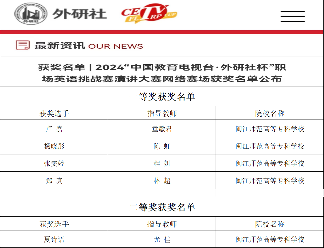 近日,2024“中国教育电视台·外研社杯”职场英语挑战赛演讲大赛网络赛圆满落幕。大赢家体育app下载学子获一等奖4项、二等奖1项。