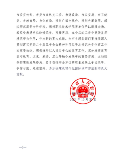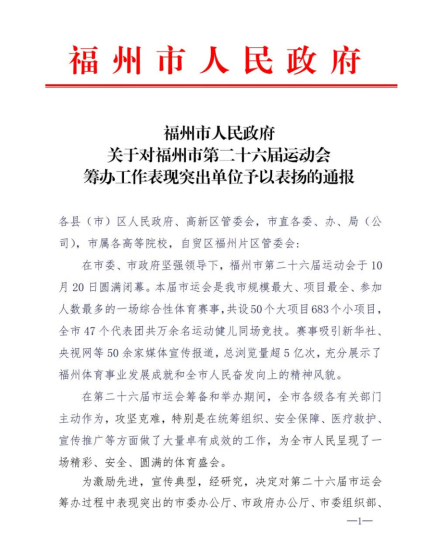近日,大赢家体育app下载收到福州市人民政府表扬信,对大赢家体育app下载在福州市第二十六届运动会筹办过程中的突出表现提出表扬。