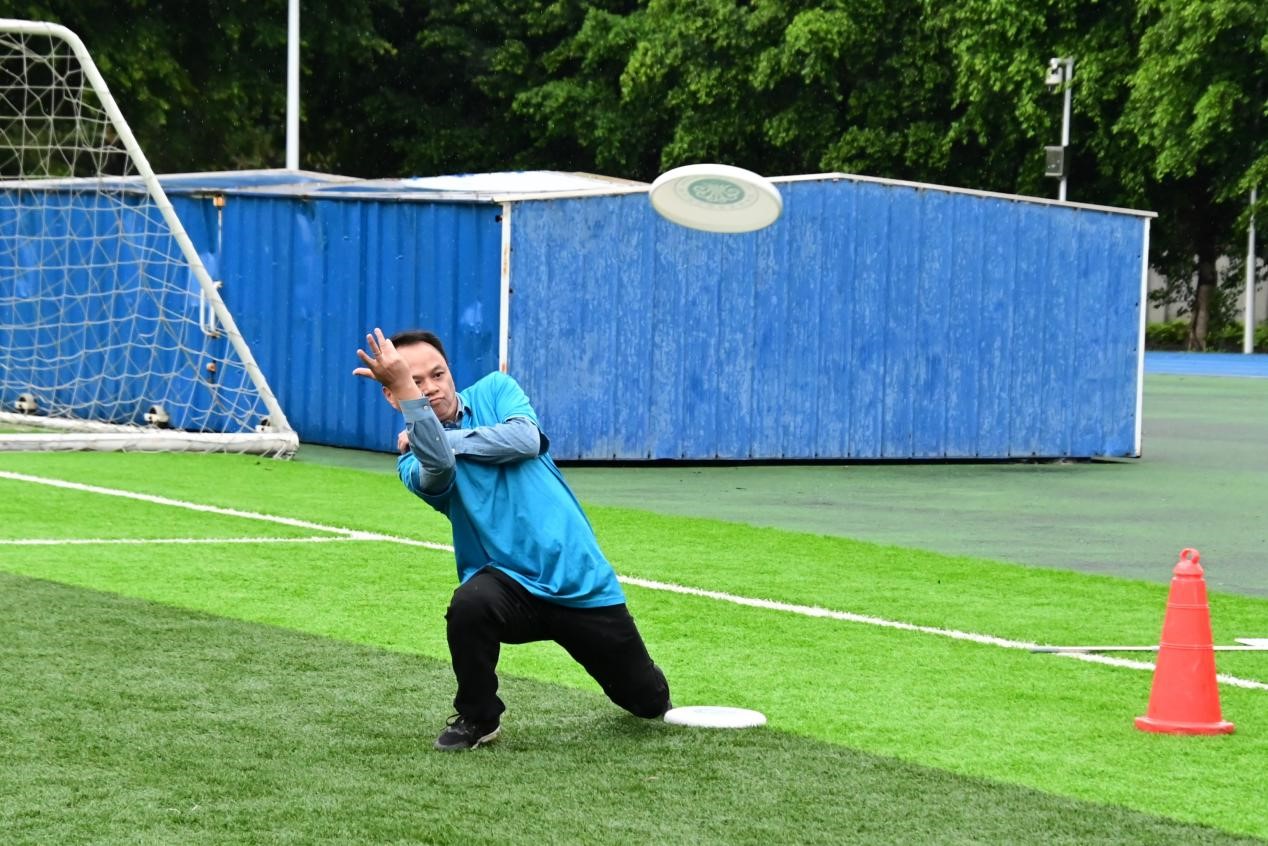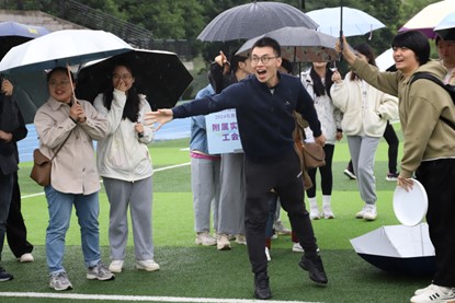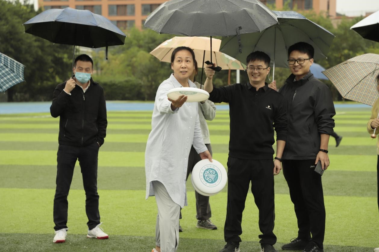 本次趣味运动会共设有“投掷入网”“九宫格”“一传到底”三个比赛项目。尽管天公不作美,绵绵细雨中教职工们的热情毫不减退,雨水增加了比赛难度,飞盘也比平时更难控制,但运动员们依然全力以赴,每一次得分都得到掌声与欢呼声。在“一传到底”的团体飞盘赛中,各队运动员们团结协作,完成了一次次精彩的传递与接盘。