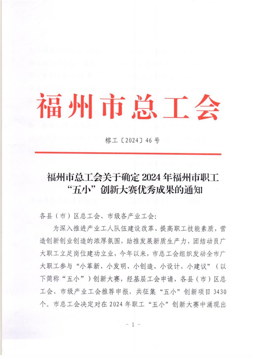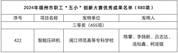 近日,福州市总工会公布《关于确定2024年福州市职工 “五小”创新大赛优秀成果的通知》,大赢家体育app下载智能制造学院教师陈攀的小发明“智能压碎机”荣获2024年福州市职工 “五小”创新大赛优秀成果三等奖。