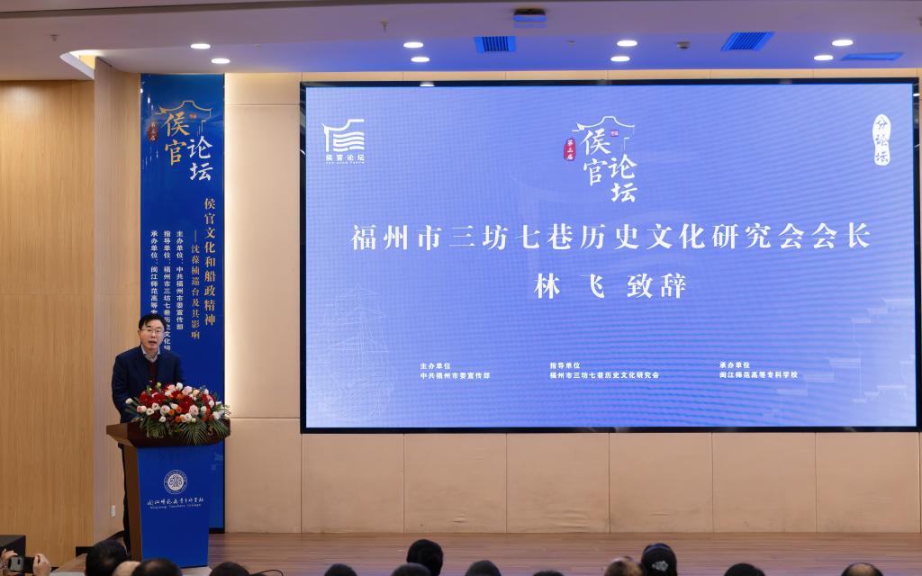 林飞在致辞中指出,侯官文化植根于福州,伴随着中国近代历史的发展进程而形成的,在国家和社会近现代转型过程中,从思想、文化、科学等多层面,多领域起到启蒙、引领作用的先进文化。在侯官文化的形成和发展过程中,福建船政所起的作用和影响是巨大和深刻的。船政精神是侯官文化的精神内核,船政文化研究和船政精神的提炼是永久的主题和常新的课题。本次论坛的举办,将为福州市三坊七巷历史文化研究会的理论研究和学术探讨以及和闽江师专之间的文化资源聚合创设新的平台。