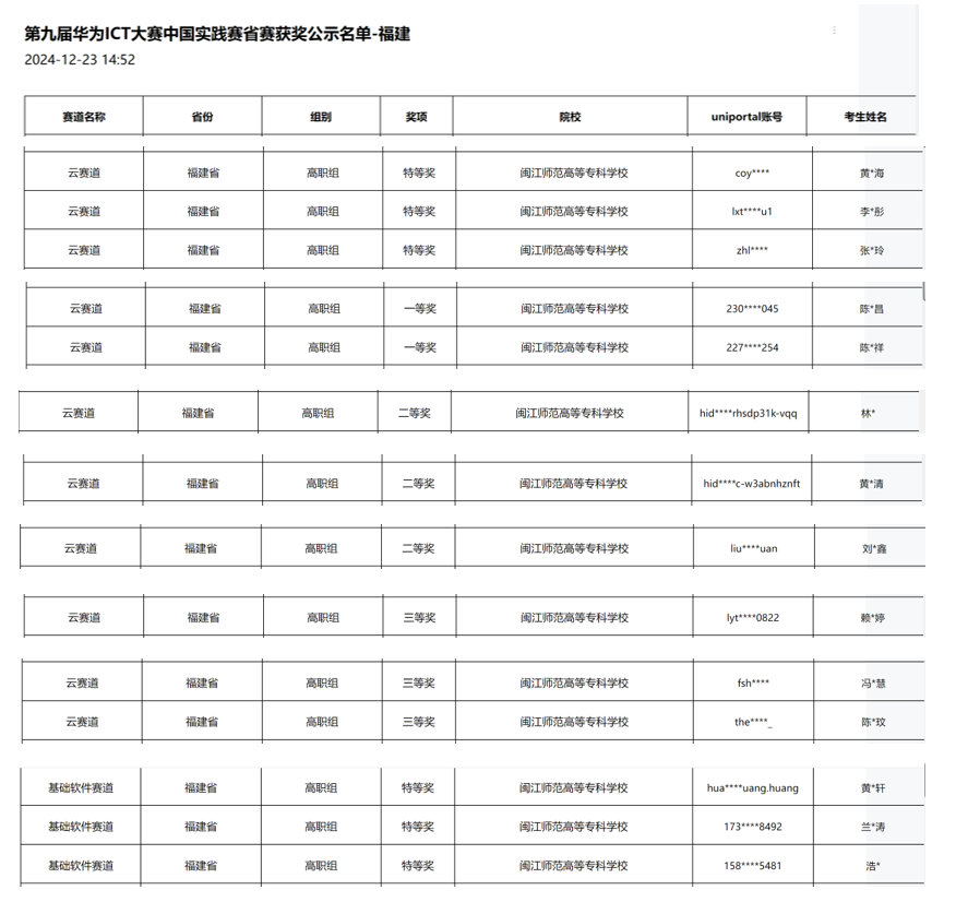 第九届华为ICT大赛中国区福建省实践赛于12月成功举办,大赢家体育app下载数字信息工程学院学生积极备赛,并在比赛过程中表现优异,荣获高职组云赛道特等奖3名、一等奖2名、二等奖3名、三等奖4名,高职组基础软件赛道特等奖3名、二等奖1名,三等奖1名。其中大数据技术专业学生黄荣海、李晓彤、张惠玲成功获得代表福建省参加华为ICT大赛2024-2025中国区云赛道决赛的资格,信息安全技术应用专业学生黄子轩、兰建涛、姚浩获得基础软件赛道国赛决赛资格。