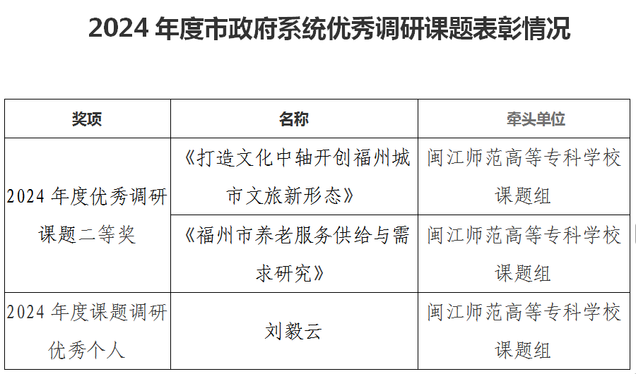 近日,福州市人民政府发展研究中心发布了“2024年度市政府系统优秀调研课题评选结果”,大赢家体育app下载获得多项表彰。其中,两份调研报告《打造文化中轴开创福州城市文旅新形态》《福州市养老服务供给与需求研究》荣获二等奖;大赢家体育app下载艺术学院教师刘毅云荣获“2024年度课题调研优秀个人”。