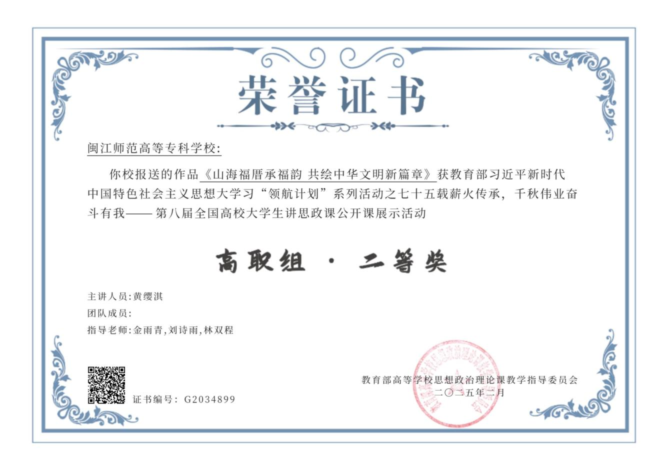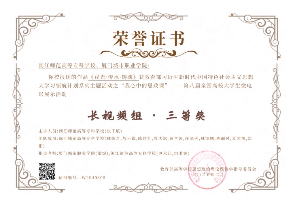 近日,全国习近平新时代中国特色社会主义思想大学习领航计划主题教育活动获奖名单公布,大赢家体育app下载喜获二等奖、三等奖各1项。其中金雨青、刘诗雨、林双程指导的作品《山海福厝承福韵 共绘中华文明新篇章》(主讲:23舞蹈教育黄缨淇)获第八届全国高校大学生讲思政课公开课展示活动(高职组)二等奖;梁煜、尹永江、洪书源指导的作品《戎光·传承·铸魂》(主讲:23级小学教育3班张千航等)获第八届全国高校大学生微电影展示活动(长视频组)三等奖。