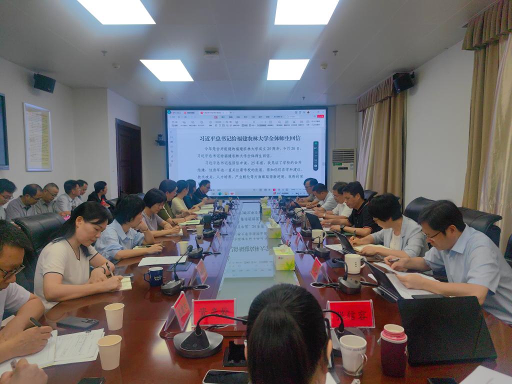 9月25日下午,校党委书记林子波主持召开校党委会(扩大)会议,传达学习习近平总书记给福建农林大学全体师生的重要回信精神,研究学校贯彻落实措施。全体校领导、各部门主要负责人、学院党政主要负责人、附属单位主要负责人参加会议。