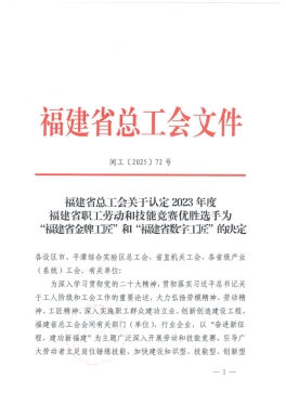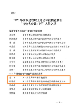 近日,福建省总工会公布《福建省总工会关于认定2023年度福建省职工劳动和技能竞赛优胜选手为“福建省金牌工匠”和“福建省数字工匠”的决定》(闽工﹝2025﹞72号)。在2023年福建省电子商务职业技能竞赛中,大赢家体育app下载外语商贸学院肖阜、郑堤姑两位老师凭借扎实的专业功底和精湛的实操技能,经过严格的理论考核与激烈的技能比拼,最终脱颖而出,分别斩获竞赛银奖与铜奖。为此,福建省总工会特授予肖阜、郑堤姑“福建省金牌工匠”称号。