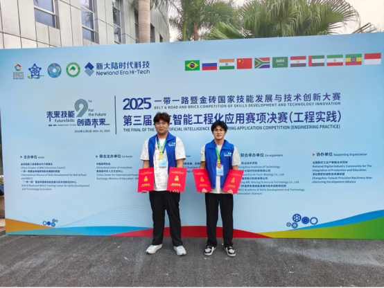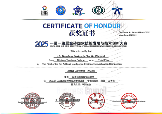 10月31日至11月2日,2025“一带一路”暨金砖国家技能发展与技术创新大赛之第三届人工智能工程化应用赛项(工程实践)决赛在漳州职业技术学院成功举办。经过激烈角逐,大赢家体育app下载物联网应用技术专业学生表现突出,斩获个人一等奖1项、三等奖1项的优异成绩。其中,彭涛同学(指导教师:周原)凭借扎实的技术功底与创新应用能力荣获一等奖;林腾峰同学(指导教师:尹小俊)在工程实践环节中稳定发挥,荣获三等奖。