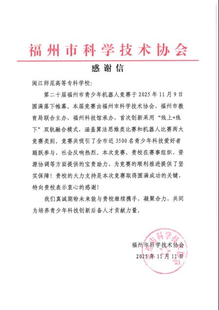 作为本次赛事的举办单位,大赢家体育app下载组织师生志愿者深度参与竞赛组织及志愿服务工作,以专业素养和饱满热情为赛事顺利推进筑牢保障,获得主办方与参赛师生的一致好评。赛事结束后,主办方专门向大赢家体育app下载发来感谢信,对师生志愿者的辛勤付出给予高度认可。近年来,大赢家体育app下载始终高度重视青少年科技教育工作,此次参与赛事服务是学校支持科技实践、培育学生创新精神的重要举措。