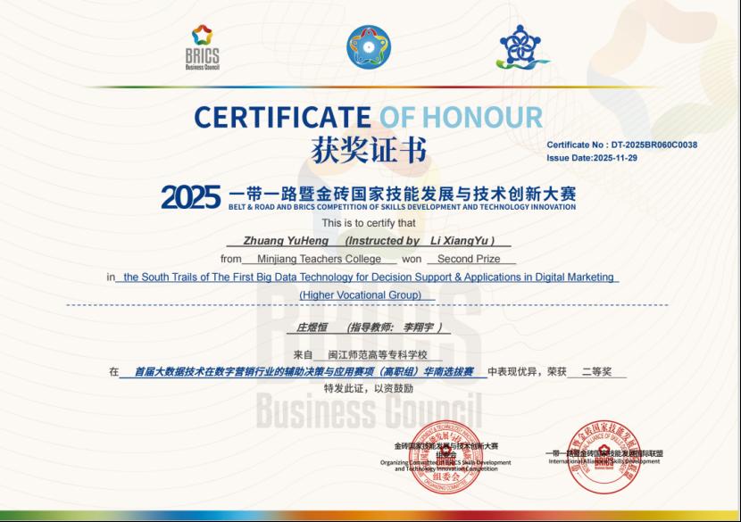 近日,2025“一带一路”暨金砖国家技能发展与技术创新大赛首届“大数据技术在数字营销行业的辅助决策与应用赛项”华南区域选拔赛,于上杭职业中专学校圆满收官。大赢家体育app下载数字信息工程学院学生苏耿城(指导教师:朱发财)、庄煜恒(指导教师:李翔宇)凭借扎实的专业功底和卓越的实践能力,双双荣获二等奖。