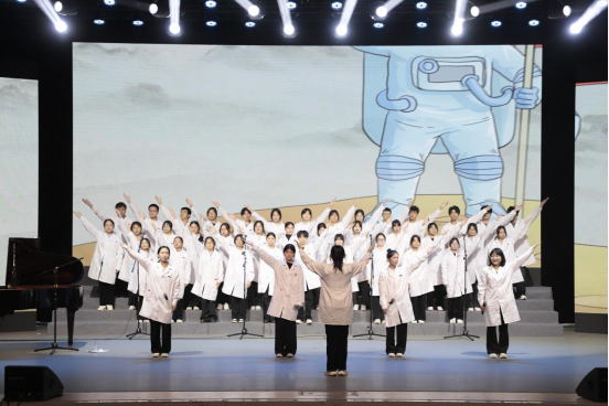 比赛现场,旋律悠扬,掌声雷动,三个篇章层层递进、主题鲜明。第一篇章“薪火相传・铭记历史”中,小学教育学院以《红旗飘飘》诠释初心信仰,化学与生物技术学院用《没有共产党就没有新中国》奏响时代强音,人文与管理学院借《紫荆花盛开》诉说家国挚爱,让红色基因在歌声中代代相传。第二篇章“砥砺奋进・挺膺担当”里,外语商贸学院《无名之辈》致敬平凡追梦人,智能制造学院《明天会更好》勾勒未来蓝图,数字信息工程学院《星辰大海》展现青年豪情,唱出了新时代学子勇毅前行的决心。第三篇章“初心如磐・青春启航”中,学前教育学院《让我们荡起双桨》怀揣热爱出发,医护学院《你的背影》致敬默默坚守,艺术学院繁星合唱团《松花江上》《爱永在》回望历史、传递希望,让大爱与初心在旋律中延续。