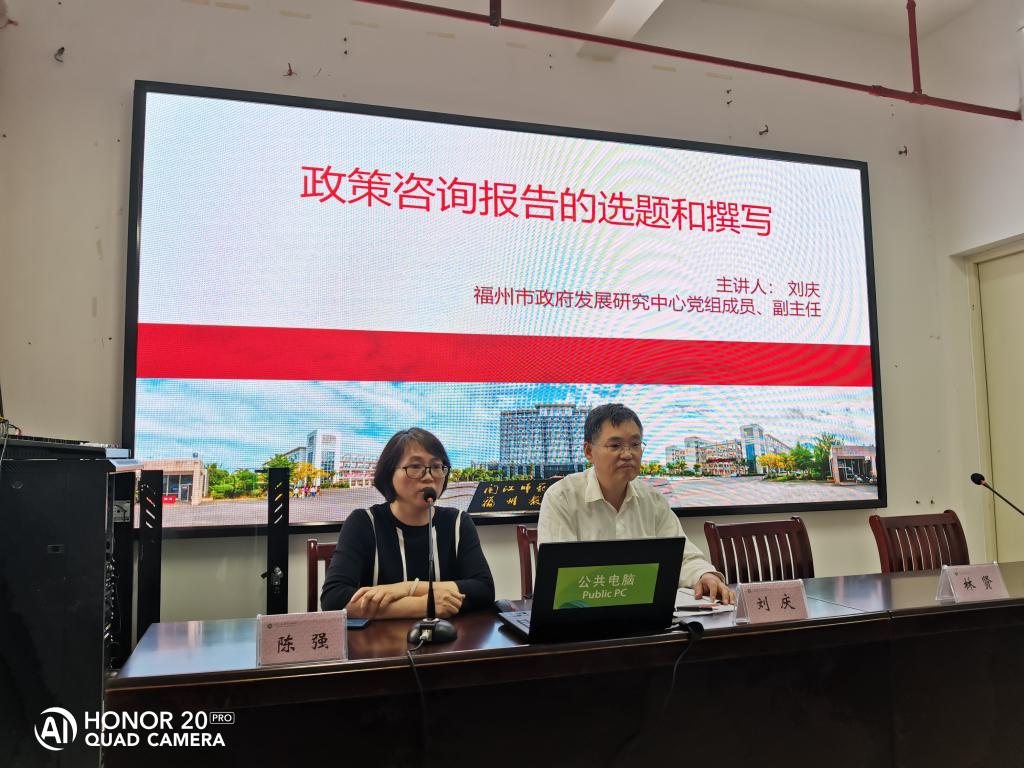 为促进大赢家体育app下载教师了解福州市区域经济发展的现状,更多参与区域经济的发展,科研处特邀请福州市政府发展研究中心党组成员、副主任刘庆,来大赢家体育app下载做“政策咨询报告的选题和撰写”专题讲座,并进行现场指导。副校长林旻、科研处处长陈强、副处长郭晓莹,各处室、教师代表以及大赢家体育app下载2021年市政府调研课题负责人等近50名教职工参与本次讲座。