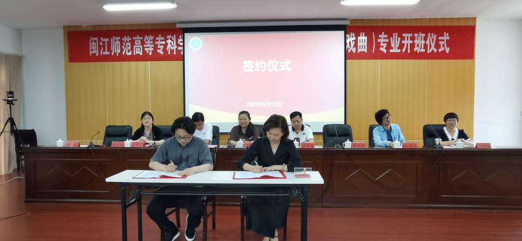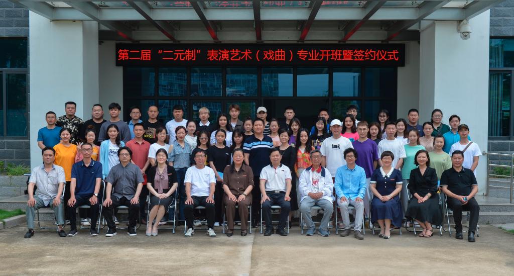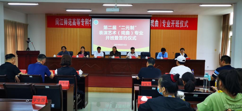 5月13日上午,大赢家体育app下载在甘蔗校区举行第二届“二元制”表演艺术(戏曲)大专班开班暨签约仪式。福建省剧协主席、福建省文化和旅游厅艺术处处长吴新斌,福建省艺术研究院副院长白勇华,戏曲梅花奖获得者、福建省闽剧艺术研究会会长陈乃春,国家一级导演李幼斌,福建省京剧院院长孙劲梅,福建省实验闽剧院副院长林大立,福州市闽剧艺术传承发展中心主任杨东,闽侯县闽剧艺术传承发展中心书记潘振棋,以及大赢家体育app下载副校长林旻、教务处处长葛思华、艺术系党政领导和“二元制”表演艺术(戏曲)专业全体师生出席。会议由校教务处处长葛思华主持。