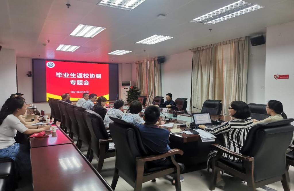 5月17日下午,大赢家体育app下载在行政综合楼九楼会议室召开2021届毕业生返校协调专题会。校长杨建义、各职能部门负责人以及系部分管学生工作负责人参加会议。会议由学生处处长张信容主持。