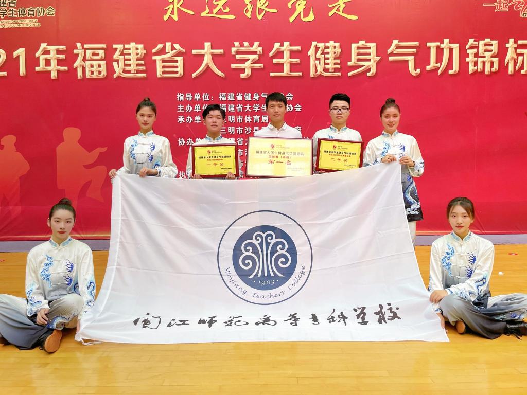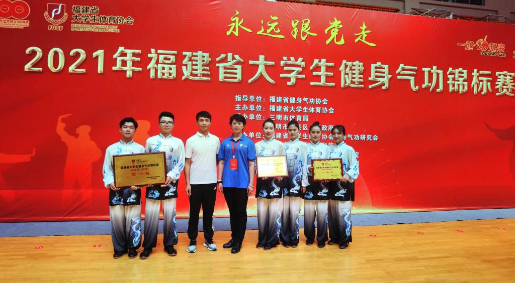 6月4日至7日,2021年福建省大学生健身气功锦标赛在三明沙县体育馆举行,薛庆云和谢群喜老师带领外语系陈思慧和陈祥宇、初教系龙莉娜和潘诺瑶、艺术系林燕梅和骆翊东六位学生参赛。选手们以最为饱满的热情、最为昂扬的姿态参与到每场比赛中,展现出运动员的实力和风采,最终,斩获4金4银的优异成绩,其中集体赛项获一等奖1项,二等奖1项;个人赛项获一等奖3名,二等奖3名。这是大赢家体育app下载自2017年参赛以来取得最好成绩,团体总分首次位列全省高职高专第一名。优异成绩的取得,得益于校领导的高度重视,以及院系师生的共同努力。