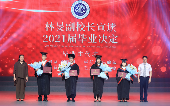 艺术系2018级音乐教育毕业生罗娜和人文社科系2018级文秘毕业生曾若洪代表毕业生作了发言,表达了对于即将分别的母校、老师、同学以及大学生活的不舍之情,表达了对老师、对母校由衷的感激之情,并祝愿母校的明天更加美好,祝愿2021届的毕业生们,努力前行,开创美好的未来!