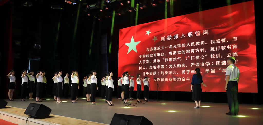 会上,45名新入职教师在鲜艳的国旗下庄严宣誓,铮铮誓言拉开了表彰大会的序幕。