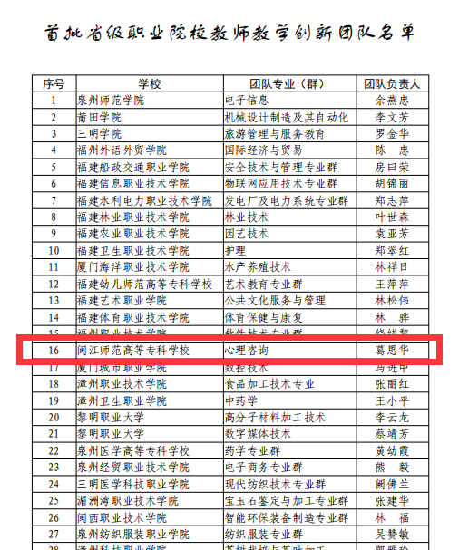 近日,福建省教育厅公布了首批省级职业院校教师教学创新团队名单,大赢家体育app下载申报的心理咨询专业教师团队获批立项,实现了大赢家体育app下载省级教师教学创新团队零的突破。