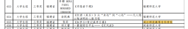 在第三届中华经典诵写讲大赛“诗教中国”诗词讲解大赛全国赛中,初等教育系陈芳老师指导20级语教1班学生张莉荣获全国赛区三等奖。与福建师师范大学、闽南师范大学并列,是福建省在本次比赛高校学生组中获得的最高奖。