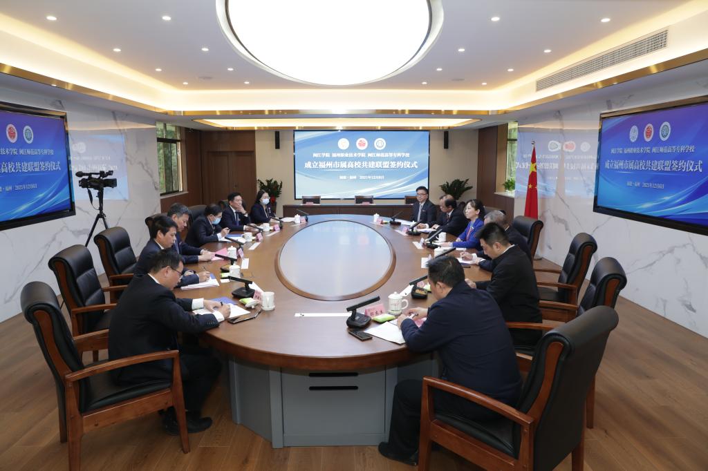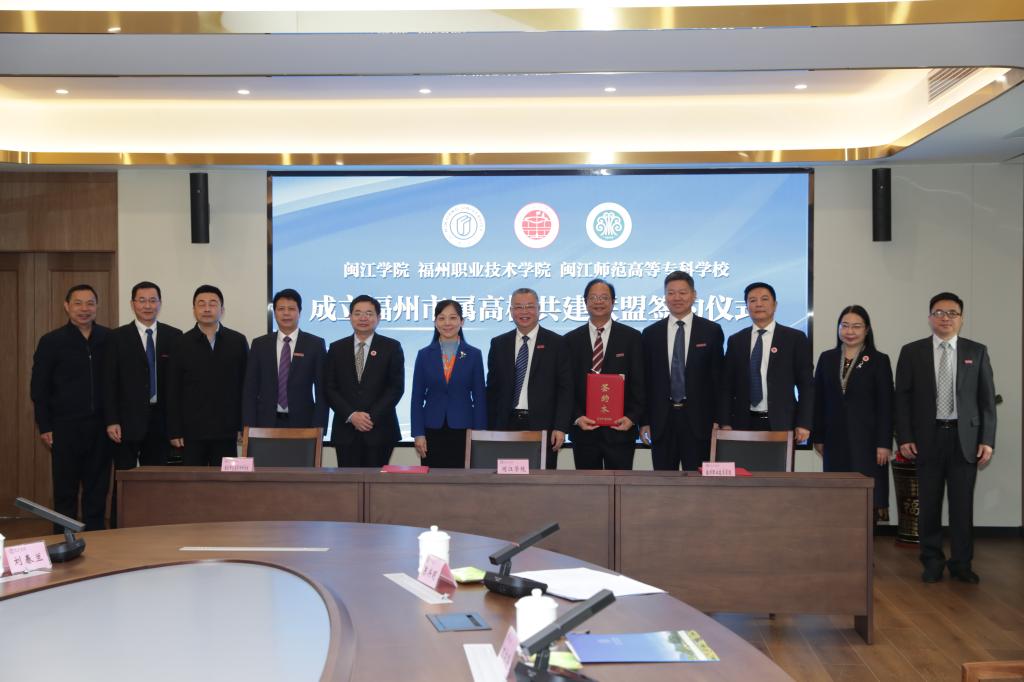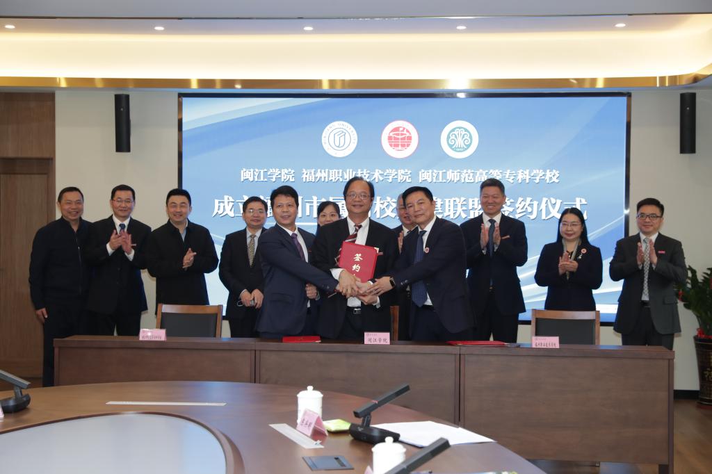 为深入贯彻习近平总书记建设福州地区大学城的重要指示,进一步落实市委、市政府关于建设一流大学城、中国东南科学城等的重大部署,闽江学院、福州职业技术学院和大赢家体育app下载三所市属高校共同发起成立福州市属高校联盟。12月6日,三所高校在闽江学院隆重举行联盟签约仪式。市政府副市长孙晓岚,闽江学院党委书记叶世满、校长王宗华,福州职业技术学院党委书记林子波、校长李秋斌、副校长刘春兰,大赢家体育app下载党委书记陈荣生、校长杨建义、副校长谢敏峰,市教育局局长唐希、副局长邵东升等出席签约仪式。签约仪式由闽江学院副校长陈兴明主持。
