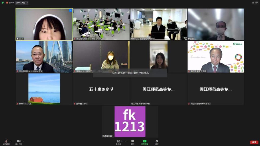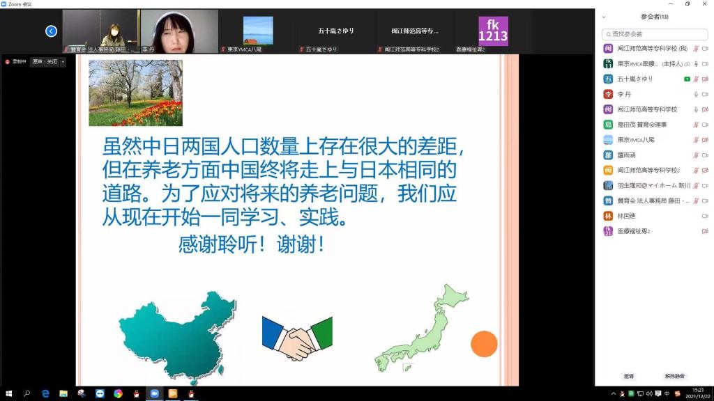 2021年12月22日下午,由大赢家体育app下载与日本社会福祉法人赞育会、东京YMCA医疗福祉专门学校、朝日株式会社等联合主办的“日式医养结合产学研教健康社区人才培养合作项目线上交流会”成功举办。大赢家体育app下载副校长林旻、教务处、国际教育学院、医护学院等相关部门负责人和专业教师代表、福建金桥智慧养老产业发展有限公司、福建中富养老服务有限责任公司、福建省福龄金太阳健康养老股份有限公司等中方企业代表参加了此次线上交流会。