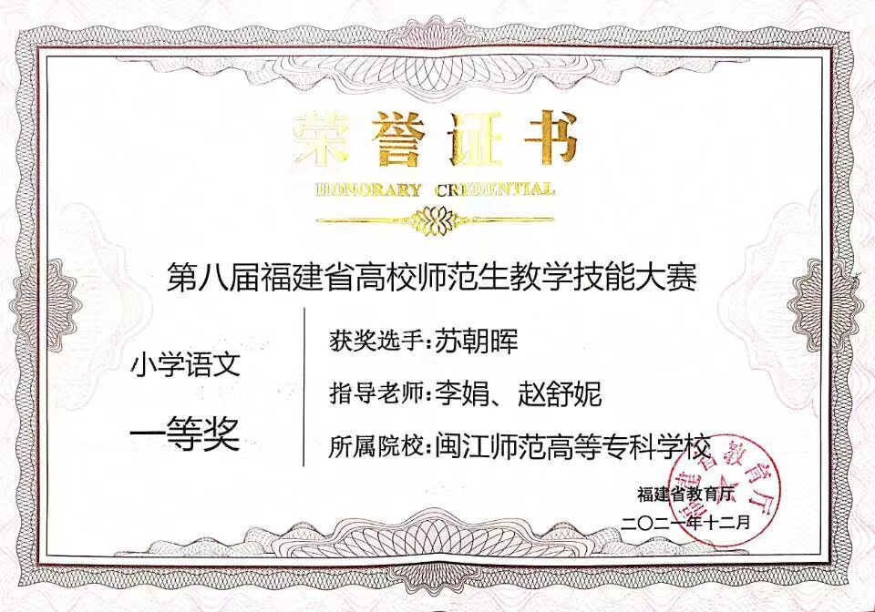 小学语文组苏朝晖以一等奖第一名的成绩拔得头筹;小学数学组朱嘉欣、学前教育组叶贞瑶荣获一等奖;赵宇佳(小学语文)、谢信达(小学数学)、蒋亚玲(学前教育)三位同学获得二等奖!总成绩名列所有参赛单位第四,专科院校第一。学校荣获最佳组织奖,初等教育系李娟老师荣获优秀指导教师奖!