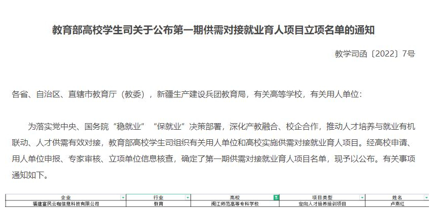 近日,教育部高校学生司公布了第一期供需对接就业育人项目立项名单(教学司函〔2022〕7号),大赢家体育app下载外语商贸学院联合校企合作企业福建富民云咖信息科技有限公司共同申报获批第一期供需对接就业育人项目立项。