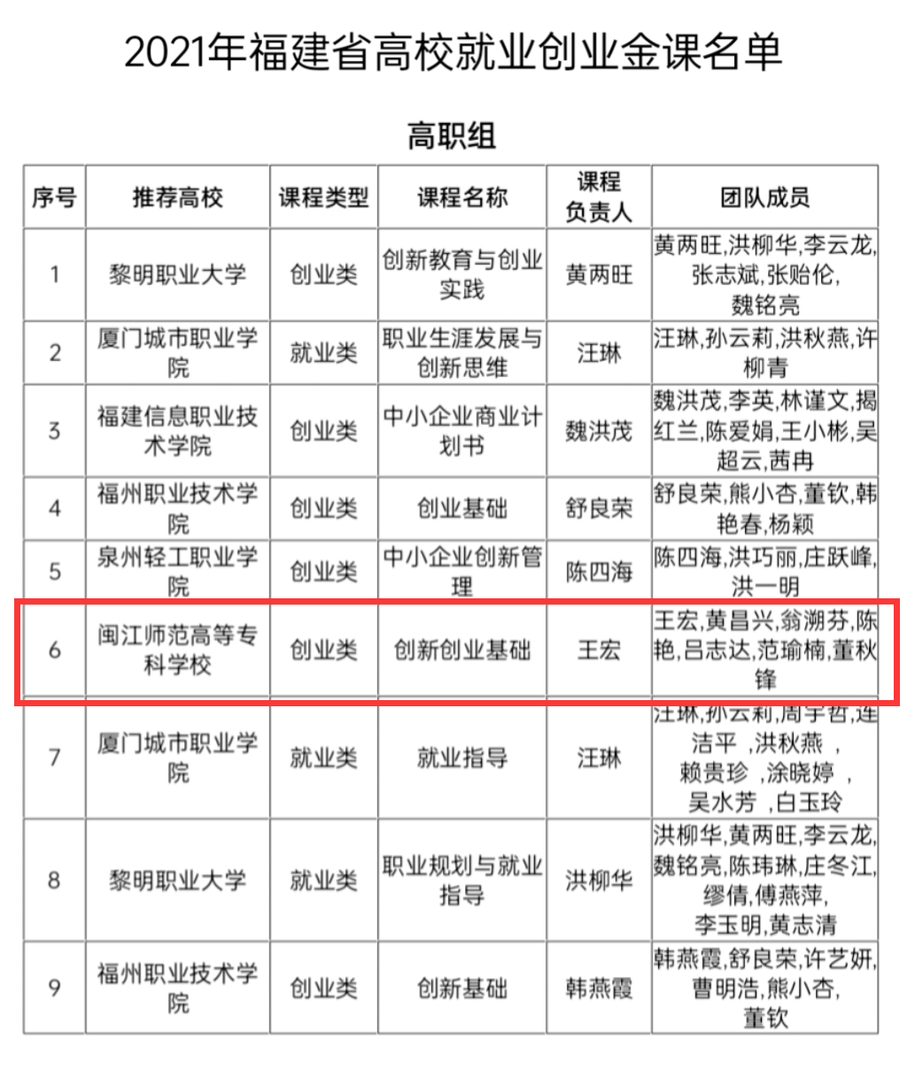 近日,福建省教育厅公布了2021年福建省高校就业创业金课名单(闽教学〔2022〕8号文)。其中大赢家体育app下载三创学院选送的《创新创业基础》课程,经省教育厅组织专家评审,被确定为2021年福建省高校就业创业金课。