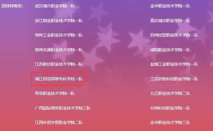 本次大赛共有1207支参赛队(其中本科组595支、高职组573支、中职组39支),共计3621名选手参加。由外语商贸学院傅雅凌、肖怡文老师带队的来自应用英语专业的6名、共2队参赛选手,经过3天的比赛,获得高职一站团体特等奖、高职二站团体一等奖、学生个人奖项跟随团体奖的优异成绩。