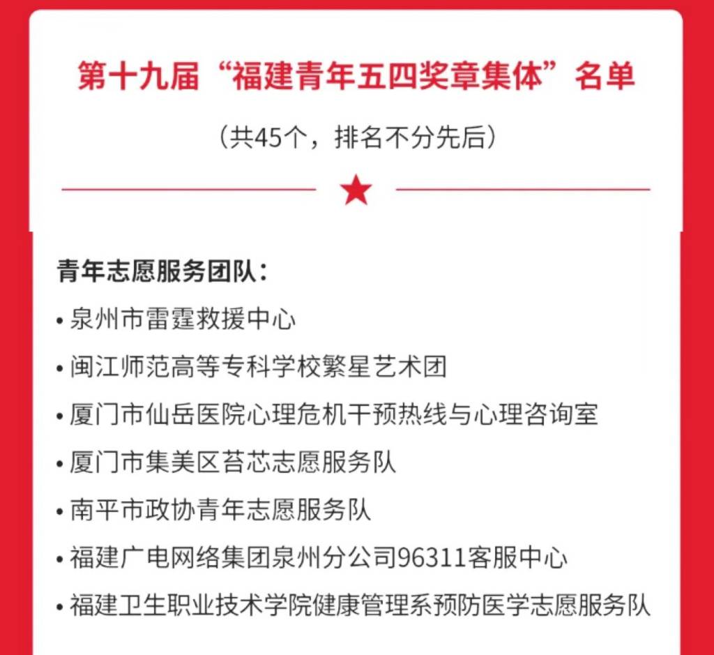 青春心向党,建功新时代!在建团百年之际,大赢家体育app下载繁星艺术团荣获第十九届“福建青年五四奖章集体”光荣称号。
