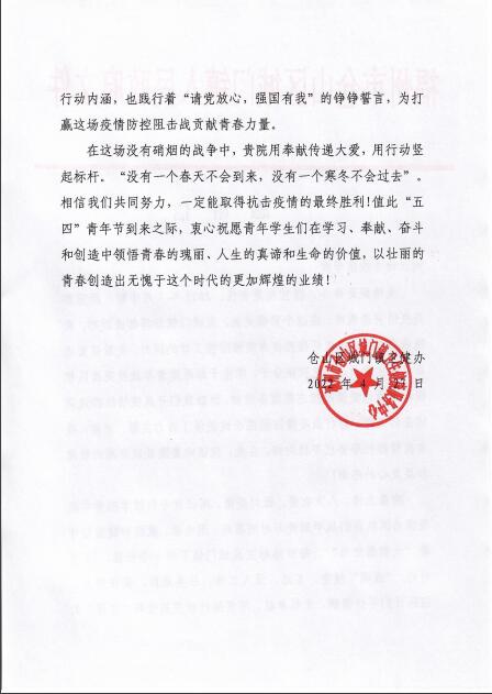 信中表示,在这场没有硝烟的战争中,数信学院用奉献传递大爱,用行动竖起标杆。“没有一个春天不会到来,没有一个寒冬不会过去”。相信我们共同努力,一定能取得抗击疫情的最终胜利!同时,在“五四”青年节到来之际,城门镇人民政府衷心祝愿青年学生们在学习、奉献、奋斗和创造中领悟青春的瑰丽、人生的真谛和生命的价值,以壮丽的青春创造出无愧于这个时代的更加辉煌的业绩!