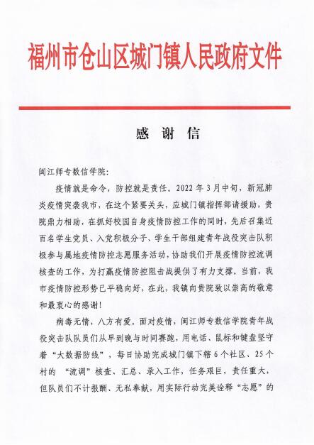 信中指出,应指挥部请援,数信学院鼎力支持,在抓好校园自身疫情防控工作的同时,先后召集近百名学生党员、入党积极分子、学生干部组建青年战役突击队积极参与属地疫情防控志愿服务活动,协助城门镇开展疫情防控流调核查的工作,为打赢疫情防控阻击战提供了有力支撑。
